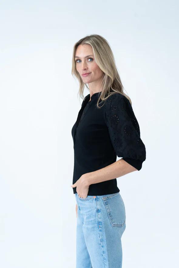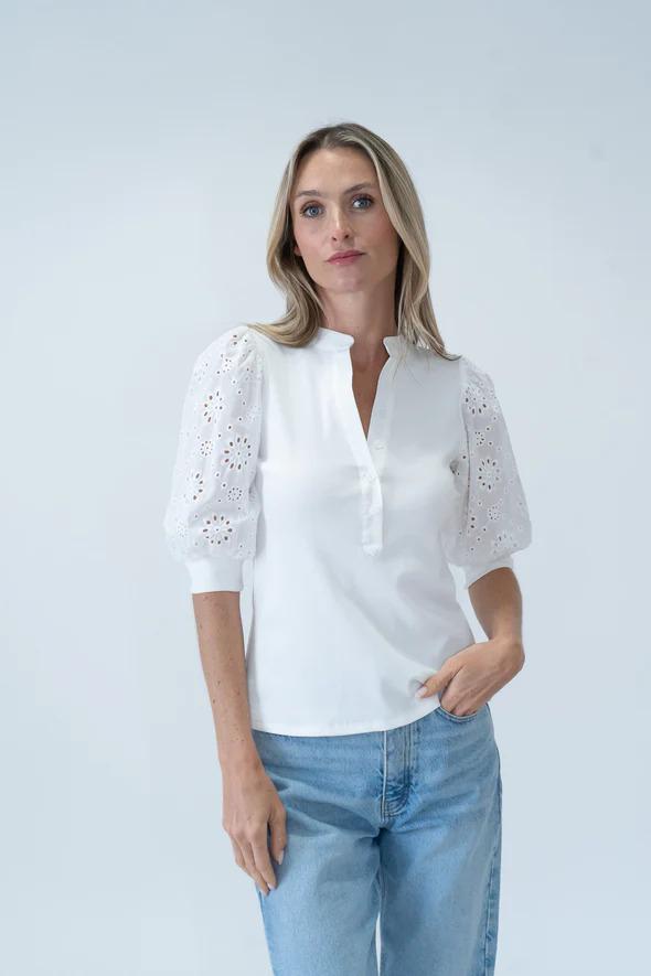 The Six Fifty Kayleigh Tee takes the classic women’s short sleeve top and gives it a fresh upgrade with ribbed fabric and subtle patterned sleeves. It’s soft, stretchy, and tailored just enough to feel styled without being stiff. The contrast in texture adds interest without overcomplicating things.It's a tee that looks intentional, even when the rest of your outfit is on autopilot.